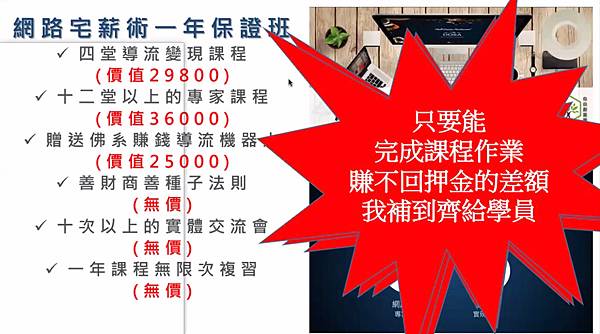 ⬇️下面是線上課程之中最神奇的,學費如同押金,如果課程內認真做作業,賺不到這筆錢就退學費的宅薪術保證班。我有兩次很忙沒辦法聽,也有錄音檔可重聽並複習。但是內容ppt有簽合約不能公開,以保障團隊講師夥伴的無償教授,及付費認真交作業的學員。