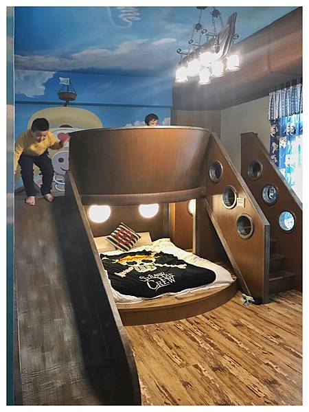 海盜船上有舵、有儀表板,海盜船下方是船艙感設計的雙人床。海盜船對面另有一張雙人床,空間很大,四個人擠在一起睡很ok,也可以各據山頭稱王。