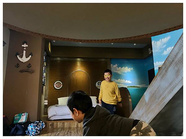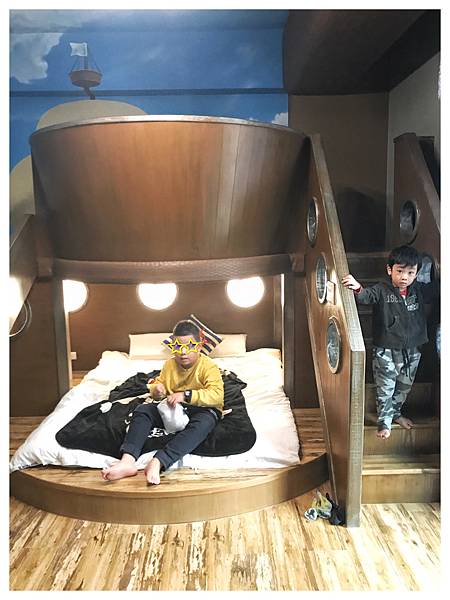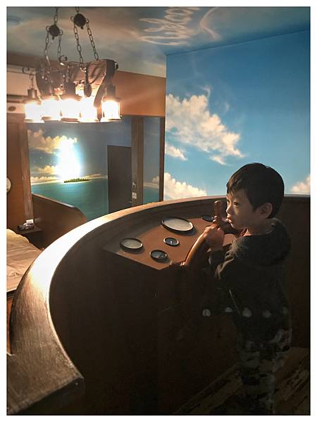 所以小年夜我們住在hikids,網路搜尋到的,剛好最適合我們四個人的海盜船房型還有。我們也算航海世家(真敢講),身為船長的兒子們與妻子,看到船類裝潢都特別有感,我幾乎是搜尋到網路照片就立刻下訂了!