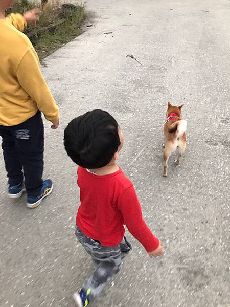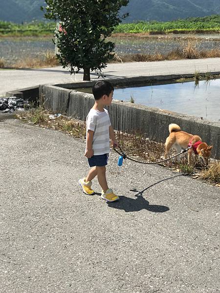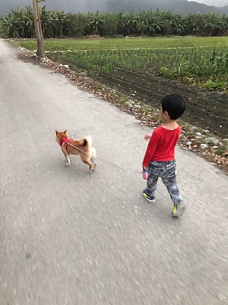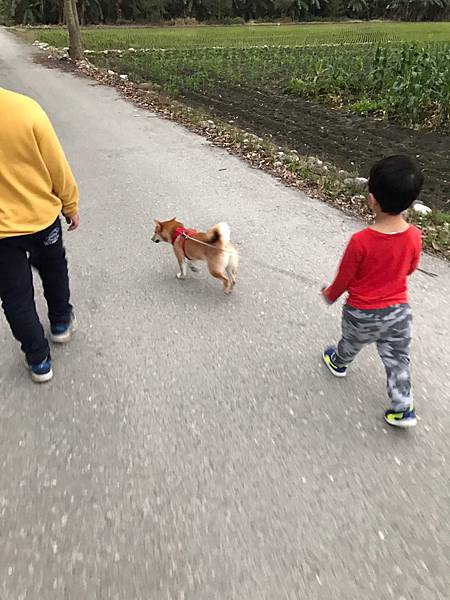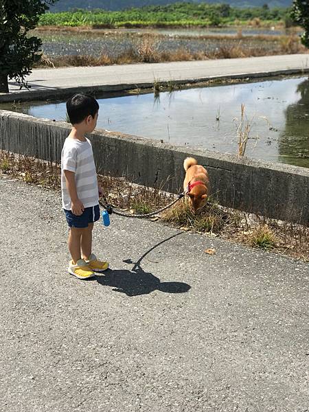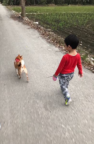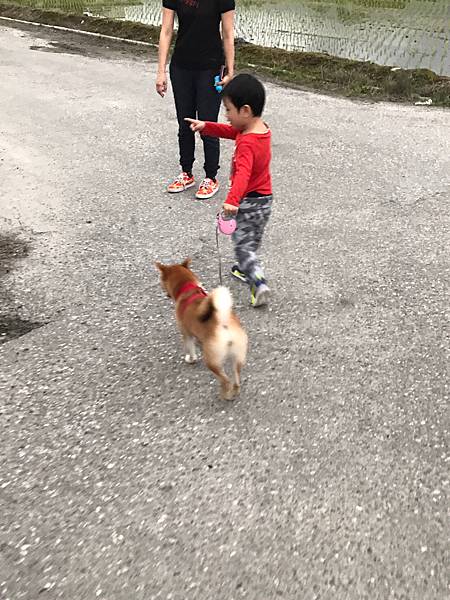 拔辣媽邀我們一起要帶狗狗散步,我們一起鄉間小路繞了一圈。小柴犬叫抖抖,小喜第一次牽狗狗,很成功,果然是膽大包天喜。