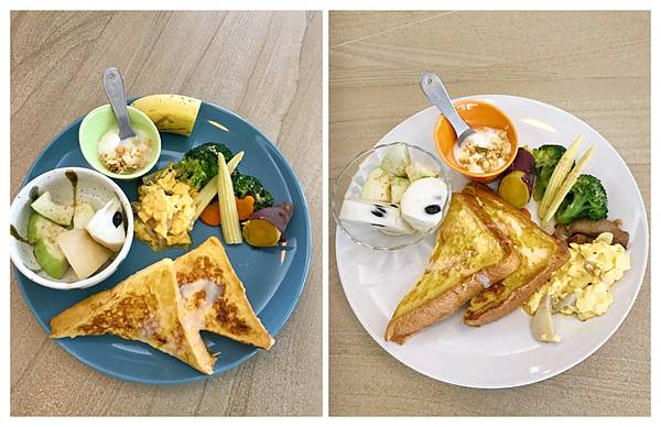 順便也看看我們第二天的早餐^_^ 兩種顏色的盤子擺在一起,視覺超飽足,而且真的也吃的很飽足!