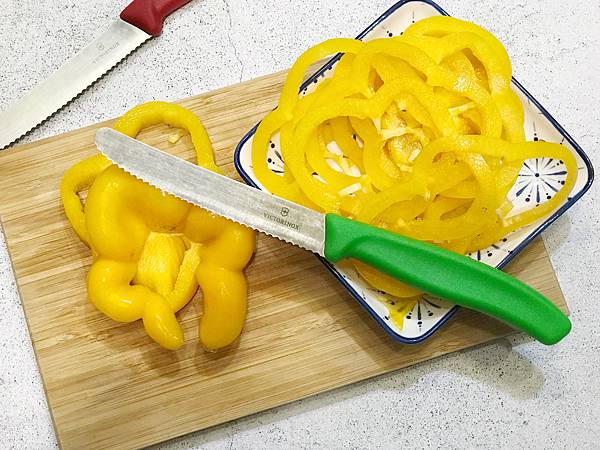 然後在準備寫推坑文時我產生了看看還能切多細的慾望。手邊剩一顆黃椒,剛好拍照後拿來練手!!!