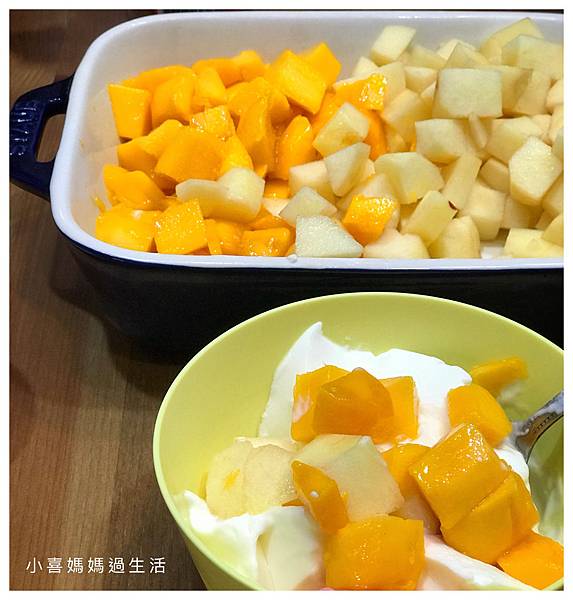 小喜每天都要吃宵夜,而且可以感覺到他希望宵夜是甜的。反正我們晚餐時間也晚,我就把宵夜當成是飯後甜點滿足他一下。旅行回來覺得大家的嗯嗯都不甚理想。鎖定水果+優格。船長的屏東麻吉寄來兩箱芒果跟上週買的蘋果就是最佳選擇。 沒有技巧可言,回家趁小喜卡通時間去把芒果跟蘋果花點時間切大丁,裝盤放冰箱。等大家洗澡後就是今日甜點宵夜時間。熟透的愛文芒果超甜,而我本來就有意替全家減點糖,所以真的是選無糖原味優格。愛甜的船長父子,我稍微用甜偏酸的草莓果醬奶酪加進去先拌一下優格,這樣優格就不會太難入口,然後就讓他們自己挖水果了。