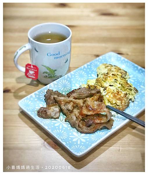 炒蛋:2顆蛋,加入保久乳(沒算份量,剩一點我都倒進去了)(一般是用鮮奶),一點鹽、羅勒葉、黑胡椒,打散。熱鍋,倒一點點橄欖油,蛋液倒入,中火,看下層凝固再炒一炒,差不多都固體就裝盤。我這次油放太少,但主要是火太大忘記調到中火,蛋底烤焦,看起來倒像是菜脯蛋的顏色😳。燒肉:牛肉片,淋一點點敘敘苑燒肉醬,蛋起鍋就把肉片放入鍋中,兩面煎一下,都熟了就裝盤,不要太老。