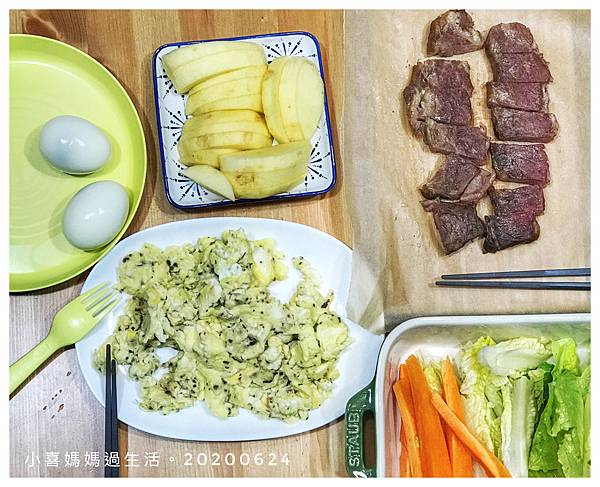 而且前一晚腦內已經跑過很多遍流程:水煮蛋(小喜指定)2顆洗蛋殼,放碗放電鍋,一杯水。前一晚已冷藏退冰牛小排放氣炸鍋,180度5分鐘。蘋果削皮切片。紅蘿蔔削皮隨便切。牛小排翻面,180度5分鐘。叫船長起床。